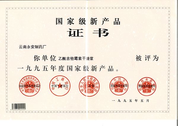 乙酰吉他霉素干糖漿國(guó)家級(jí)產(chǎn)品證書(1995年)